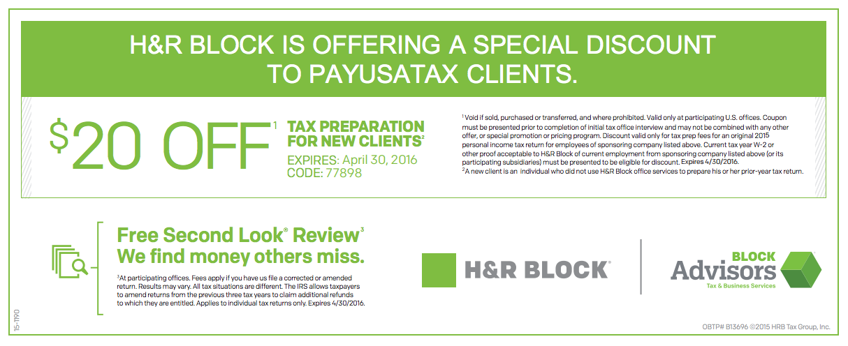 $50 Off H&R Block Coupons & Promo Codes | July 2022 Save with these H&R Block discounts and coupon codes - 9 active codes. $50 Off. Code. Get $50 Off at H&R Block. Save $50 Off On Your Order. Reveal Code. Ends Aug 8th. Save Now. H&R Block on eBay. 5% Off H&R Block Coupons, Promo Codes + 1% Cash Back 2022 Annual Sales. H&R Block's biggest sales coincide with tax season. The company's tax season sale includes discounts, usually 30-50%, off filing services. Customers can expect around $20 Deluxe, Premium and Self-Employed online filing options as well as around $30 off expert-assisted programs.